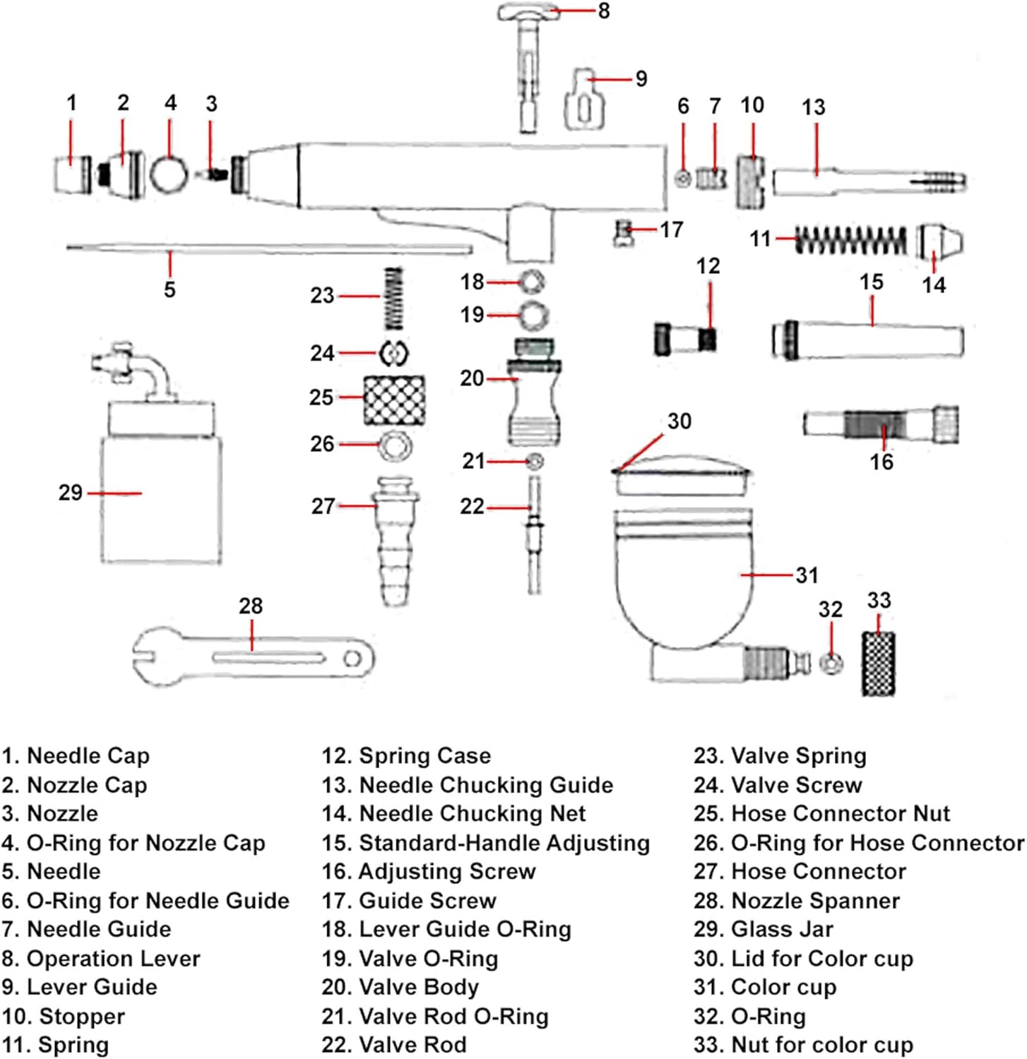 This professional airbrush gun is not just for professional users. Thanks to its nozzle diameter of 0.3 mm and the large capacity of the cup, this model is particularly suitable for paints of large regular surfaces and also for coarsely pigmented paints or lacquers. The adjustment of the painting/air mixture is done by a double control type (Double-action function). The amount of paint passage can be adjusted by the adjusting screw at the end of the handle. Explanation of the type of double It is called simple regulation or simple action the fact of adjusting the amount of air with a control lever while the paint flow is done with another regulator. In case of double regulation or double action, everything is done with a single lever: the air supply is regulated by pressing the lever, and the paint flow can be varied at the same time by pulling the lever on the back. By pressing the lever the compressed air exits to the front cap. Only by pulling the lever on the back, the paint comes out through the nozzle and is sprayed by air on the object to be painted. The more you pull the lever, the more paint is sprayed. It requires some learning but the result is very good. The maximum paint flow can be adjusted by adjusting screw on the back. Please note: important indication Area of use The intelligent solution: the ideal and high performance device for all spraying jobs, whether for beginners or professionals in model making, ceramics, pottery, cosmetics, nail salons, helmets, technical reproductions, tanning, tattoos, textiles, nail art workshops, water-based paint jobs or for any simple spray job. Scope of delivery 15 ml Pipette Nozzle wrench Airbrush in case Hose adapter connector (4 mm)